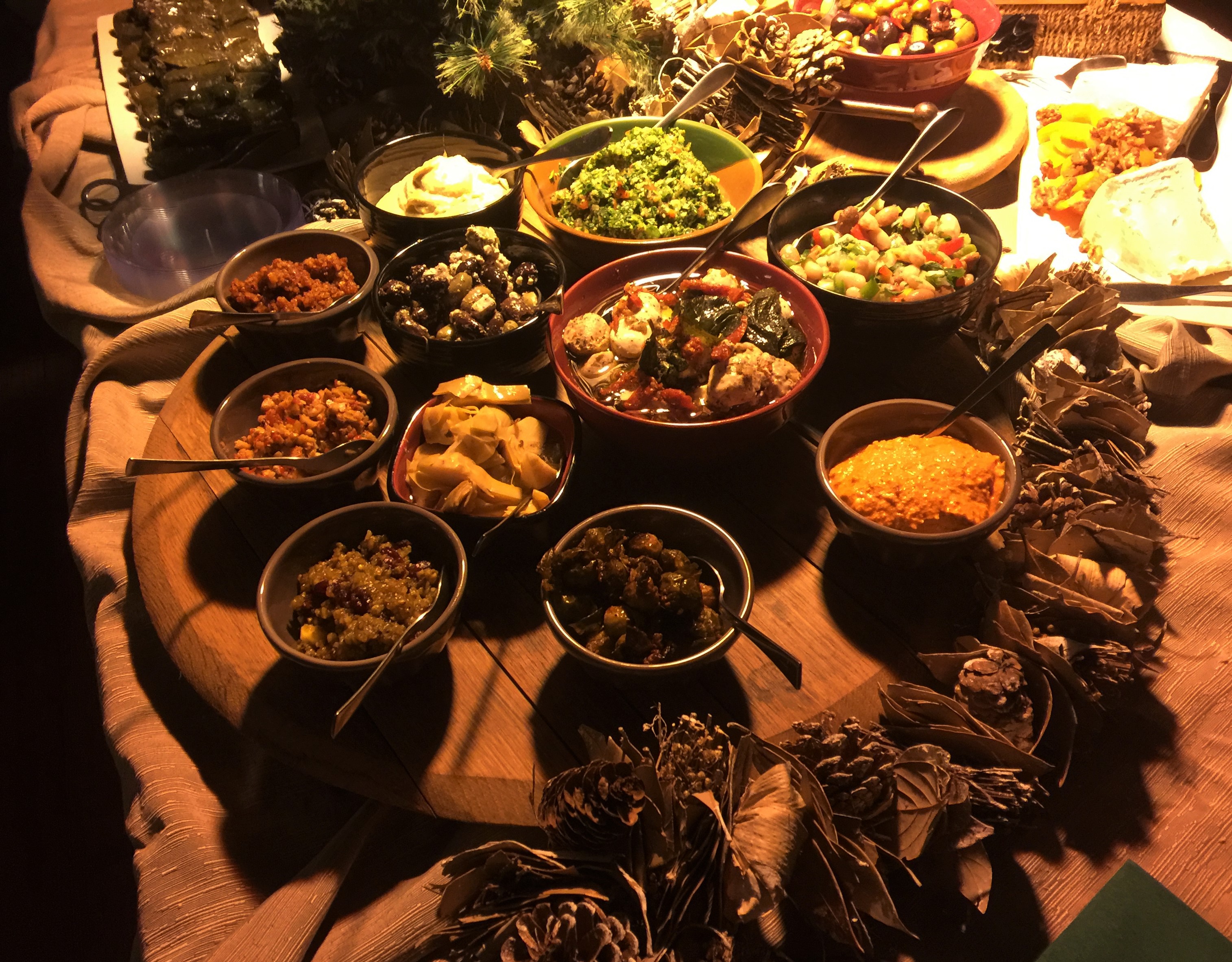Hummus, tabouleh, etch, muhammara, feta spread, baked eggplant, falafel, dolma, tapenade, lentil pilaf
